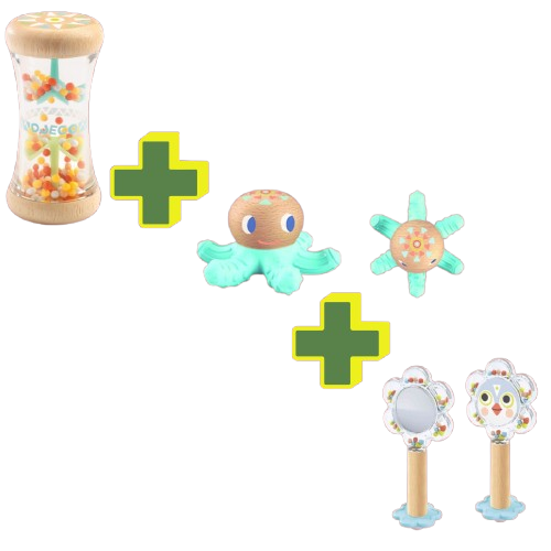 Set consisting of: Maraca (JAGUAR) + OCTOP teether in wood and silicone + Babyflower Rattle
