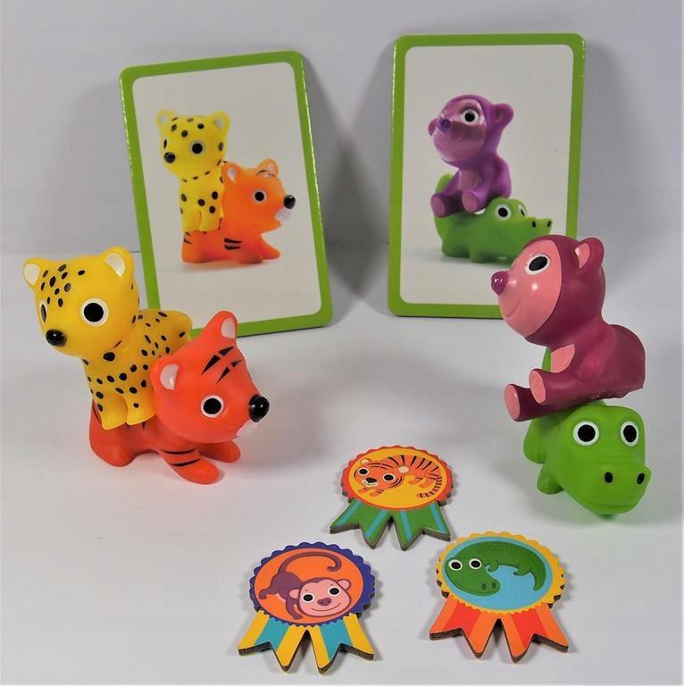Contains 6 rubber animals (leopard, koala, tiger, toucan, monkey and crocodile), 20 action cards and 12 point medals