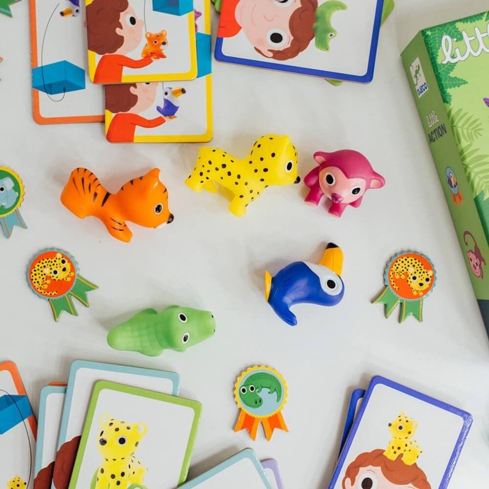 Each turn, players choose a card and must complete the corresponding action: build a tower with 3 animals, balance an animal on their head without letting it fall, make a basket, throw an animal and catch it in the air, among others. fun activities!