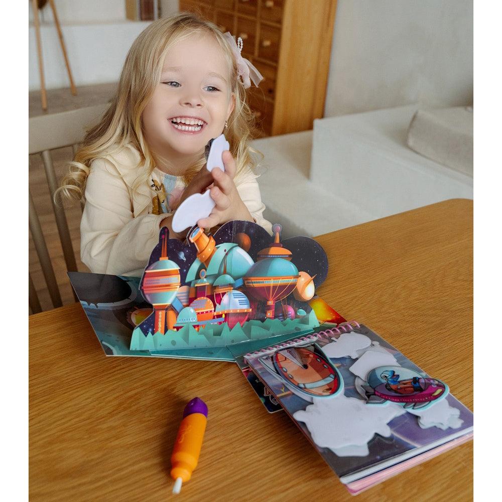 Este livro único combina três elementos de diversão: um bloco de desenhos mágicos, um desdobrável com autocolantes reutilizáveis e um pop-up 3D com autocolantes 3D puffy.