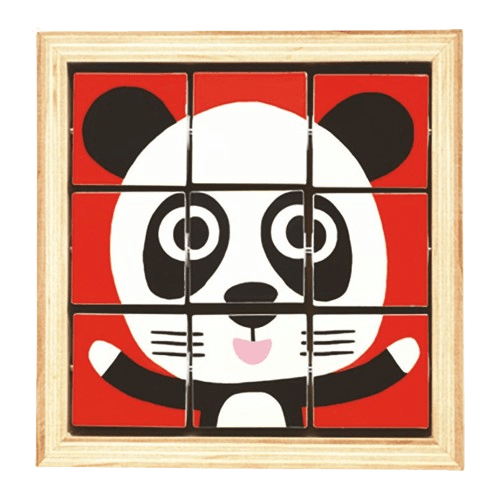 🐖 Este puzzle engraçado numa moldura de madeira oferece diversão educativa, desafiando a criança a girar os blocos para recriar o leão, o panda e o sapo.